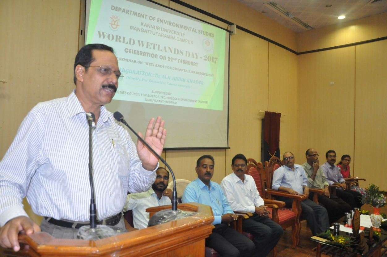 The Department of Environmental Studies, Kannur University has observed World Wetland day-2017 in association with Kerala State Council for Science, Technology and Environment (KSCSTE) on 09th and 22nd February, 2017. The activities scheduled in connection with the celebration were documentary show, painting and photography competition, field visit and one day seminar. The documentary show, painting and photography competition and field visit were conducted on 09th February, 2017 and the seminar on 22nd February, 2017. The formal inauguration of the seminar was carried out by Dr. Abdul Khader, Hon’ble Vice Chancellor of Kannur University.  After the tea break, Seminar on wetlands for Disaster Risk Reduction began at on 11AM. O. Jayarajan, IFS (Rtd.) was the resourceperson for the seminar.